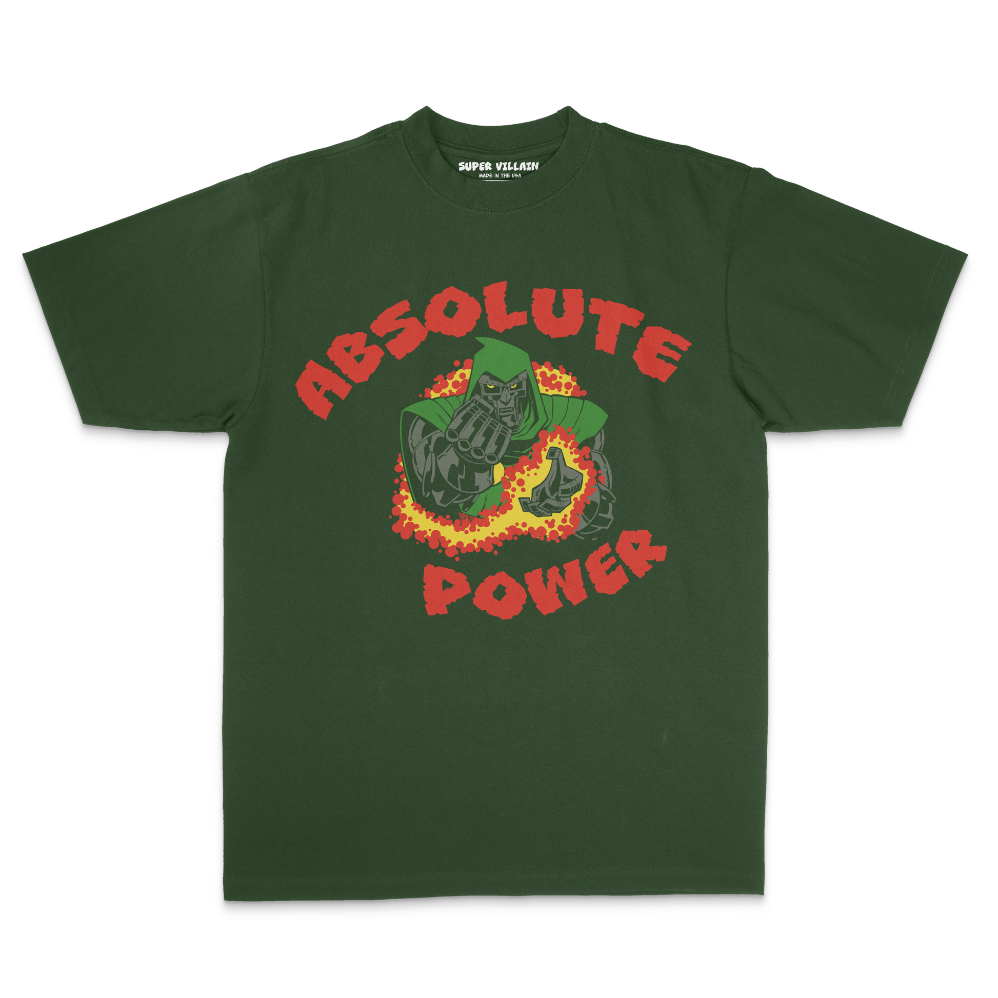 Introducing Absolute Power, a striking tribute to one of Marvel's most formidable villains. This expertly crafted tee showcases Dr. Doom with his palm raised, crackling energy radiating across his iconic silhouette. The design employs a sophisticated four-color screen print technique in red, yellow, green, and grey, delivering exceptional detail and durability. Available in forest green and black, each colorway offers a distinct aesthetic while maintaining the bold impact of the artwork. Perfect for collectors and fans who appreciate premium graphic tees with commanding presence.