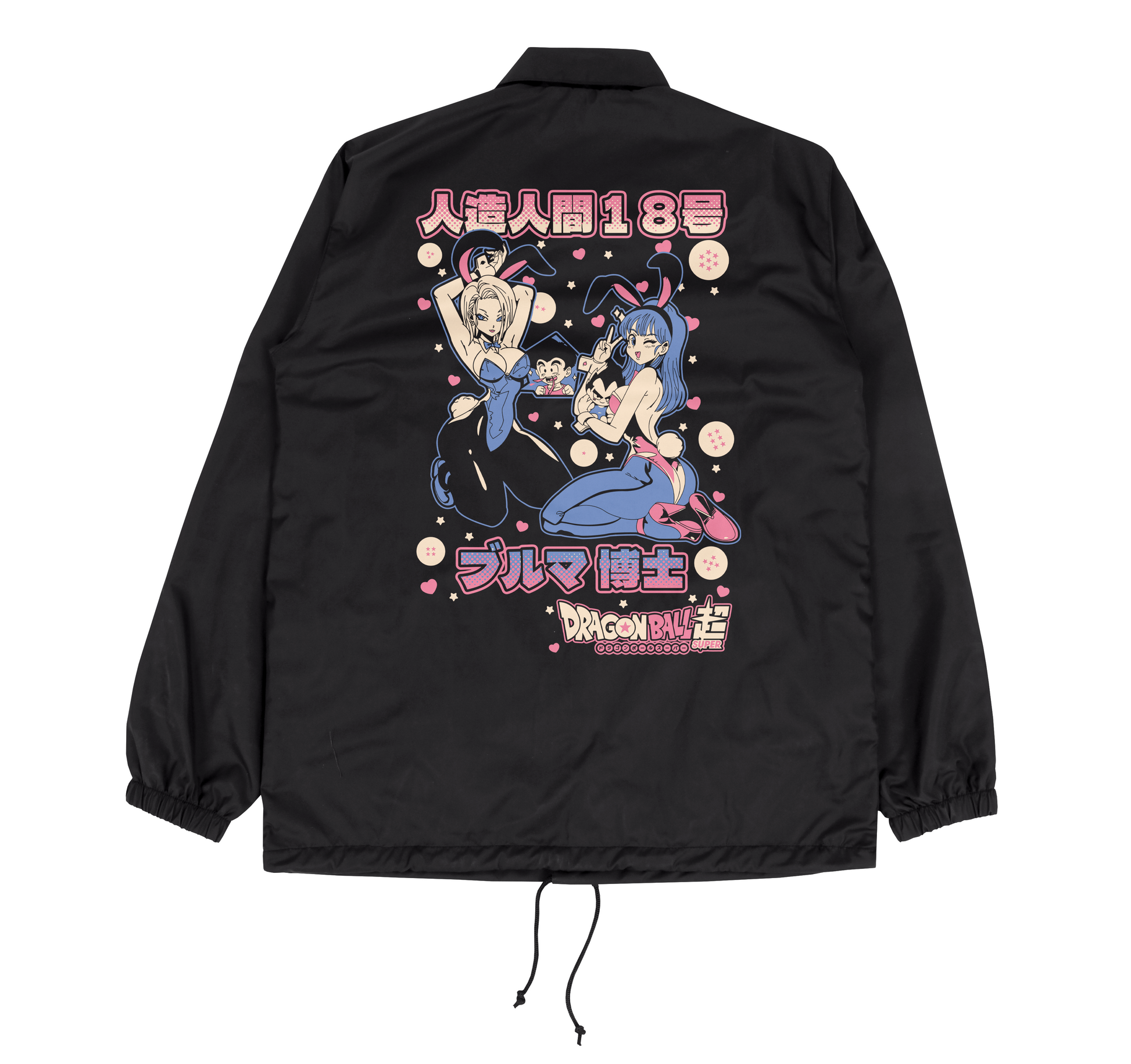Elevate your anime collection with this expertly crafted coaches jacket. The back showcases Android 18 and Bulma in playful bunny suits through high-quality screen printing that captures every vibrant detail. The front pocket features the iconic Dragon Ball Super logo, creating a balanced design that appeals to dedicated fans. Built with the durability and comfort expected from premium athletic wear, this piece merges fandom passion with timeless jacket styling.