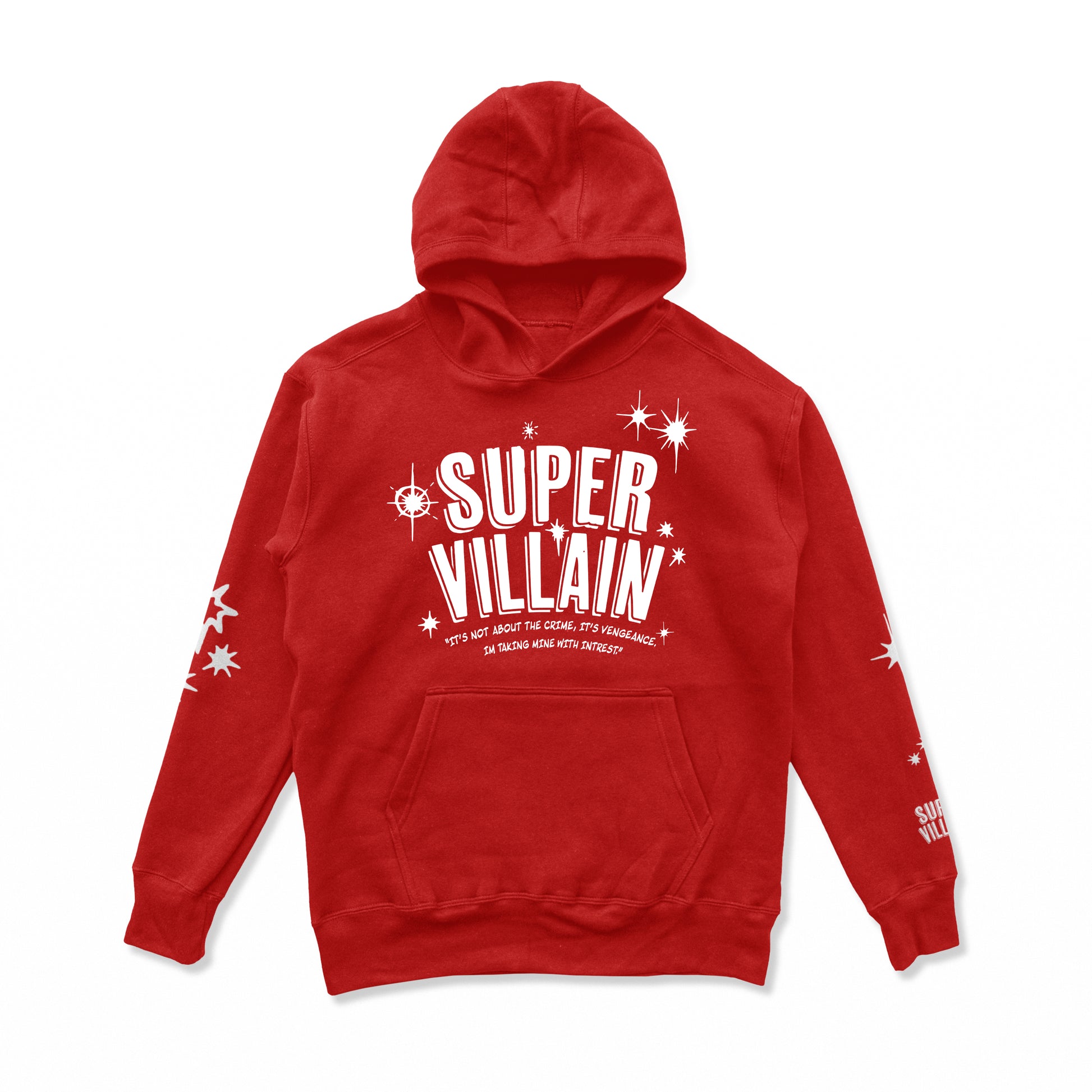 Make a bold statement with this striking screen-printed hoodie, available in rich red or deep blue. The chest features an expansive arching "Super Villain" graphic in crisp white, with comic-style lettering beneath declaring "It's not about the crime, it's vengeance." Dynamic exploding stars across the sleeves echo the galactic aesthetic, while "Super Villain" runs horizontally along the cuff for cohesive branding. Built for durability and comfort, this hoodie merges edgy design with wearable quality—perfect for those who embrace their villainous persona.