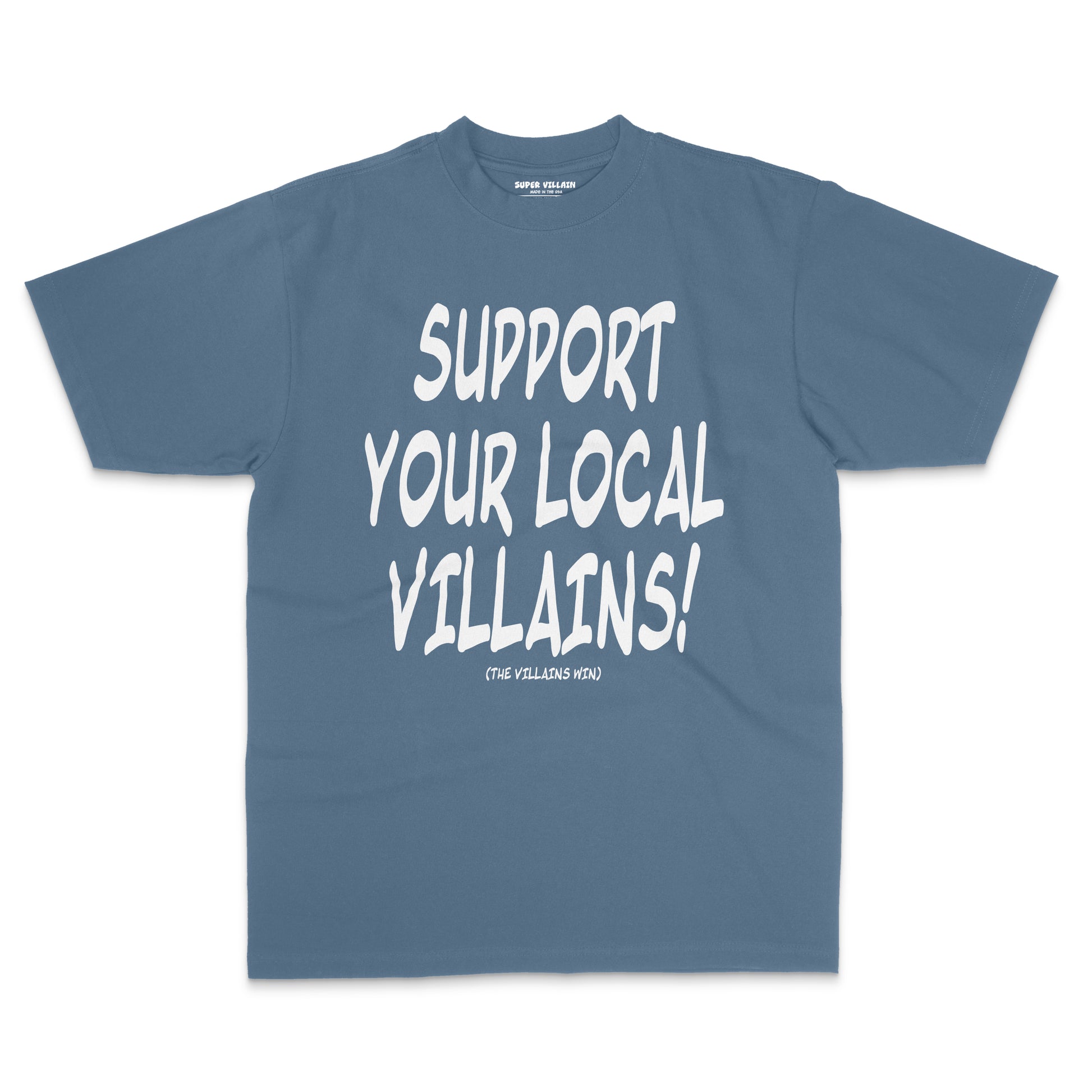 Embrace your darker side with this bold white screen-printed tee featuring eye-catching comic-style typography. The front displays "Support Your Local Villains" in large, striking letters, while a smaller subtitle declares "The Villains Win"—a perfect statement piece for those who appreciate edgy humor and unconventional style. Crafted for comfort and durability, this tee combines quality construction with standout design that sparks conversation. Ideal for fans of villain aesthetics, comic culture, and apparel that challenges the status quo.